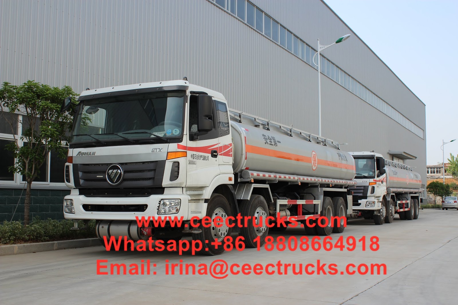 25,000L oil tanker truck, FOTON 8x4 heavy duty model chassis, FAST 9-shift manual gearbox, SHANGCHAI 260HP diesel engine, standard fuel tanker, famous brand oil pump as standard, All painting and logos depend on requirement.